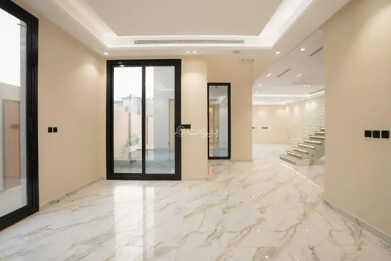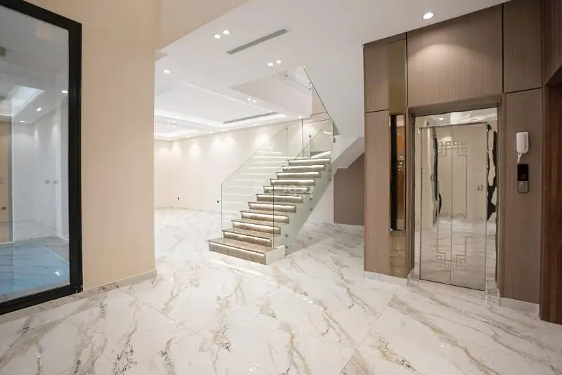 • درج فاخر: درجات رخامية مع درابزين زجاجي أنيق.